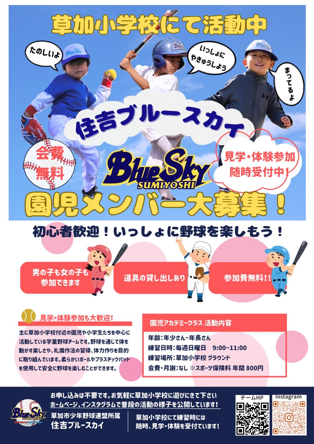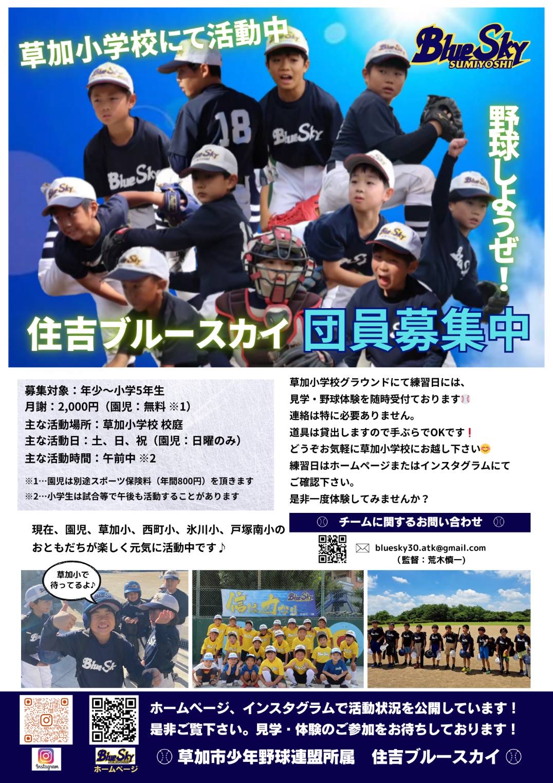 住吉ブルースカイは埼玉県草加市にある軟式少年野球チーム(草加市少年野球連盟所属)です。